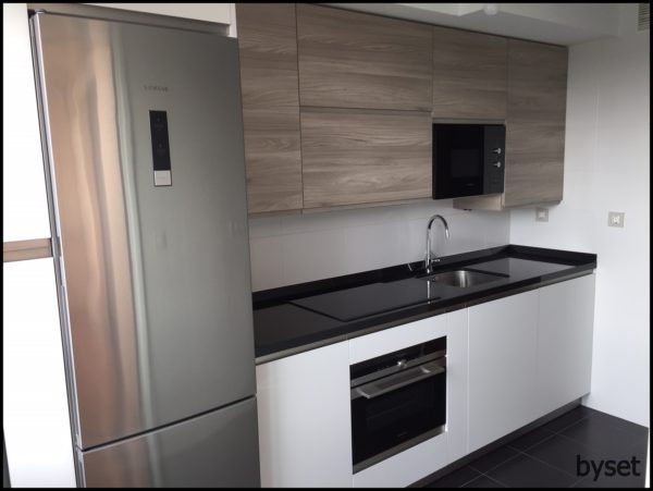 Cocina fabricada en acabados alto brillo y laminado madera.