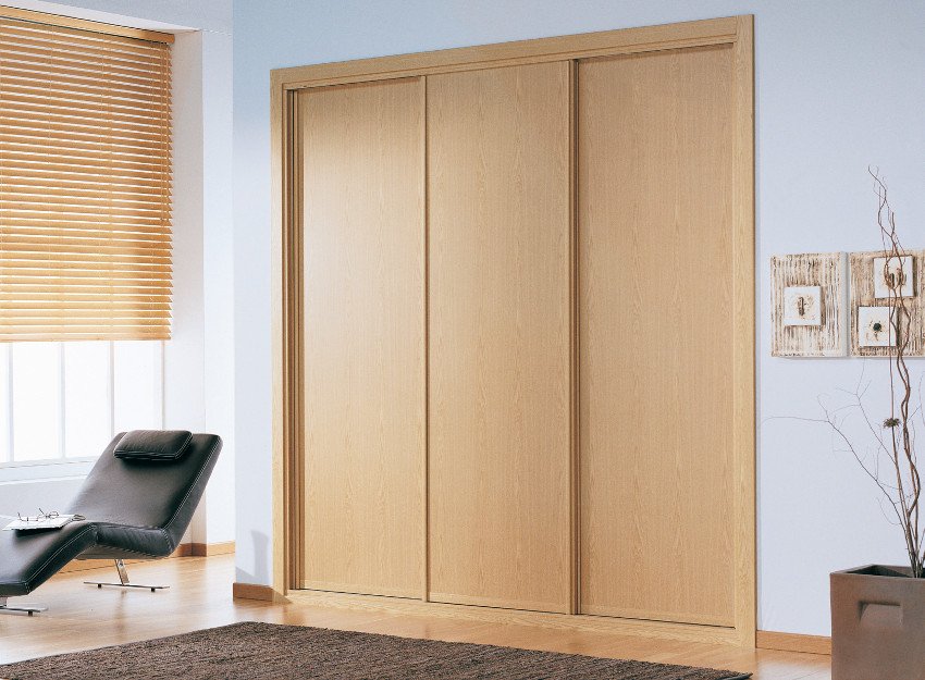 Frente de armario empotrado liso en melamina de Roble. Perfilería de aluminio recubierta de melamina con freno hidráulico.